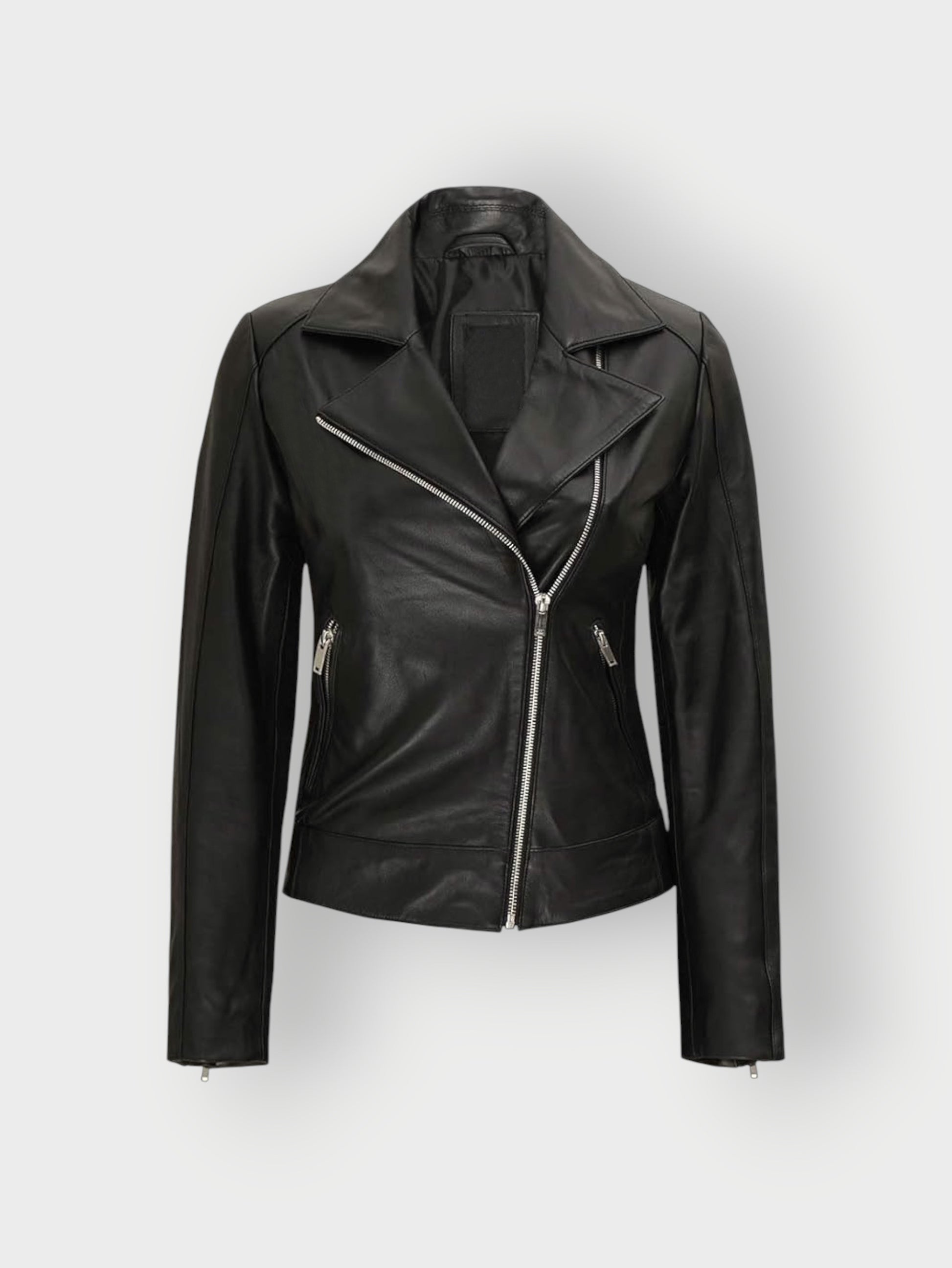 Some pieces are simply legendary, and this is one of them. Our women's black biker leather jacket gives you instant, confident style with its iconic asymmetrical zip and sharp lapel collar. Crafted from smooth, genuine leather, the tailored fit keeps your look sleek and feminine while still packing a punch. It's the ultimate piece to transform any outfit from basic to bold.