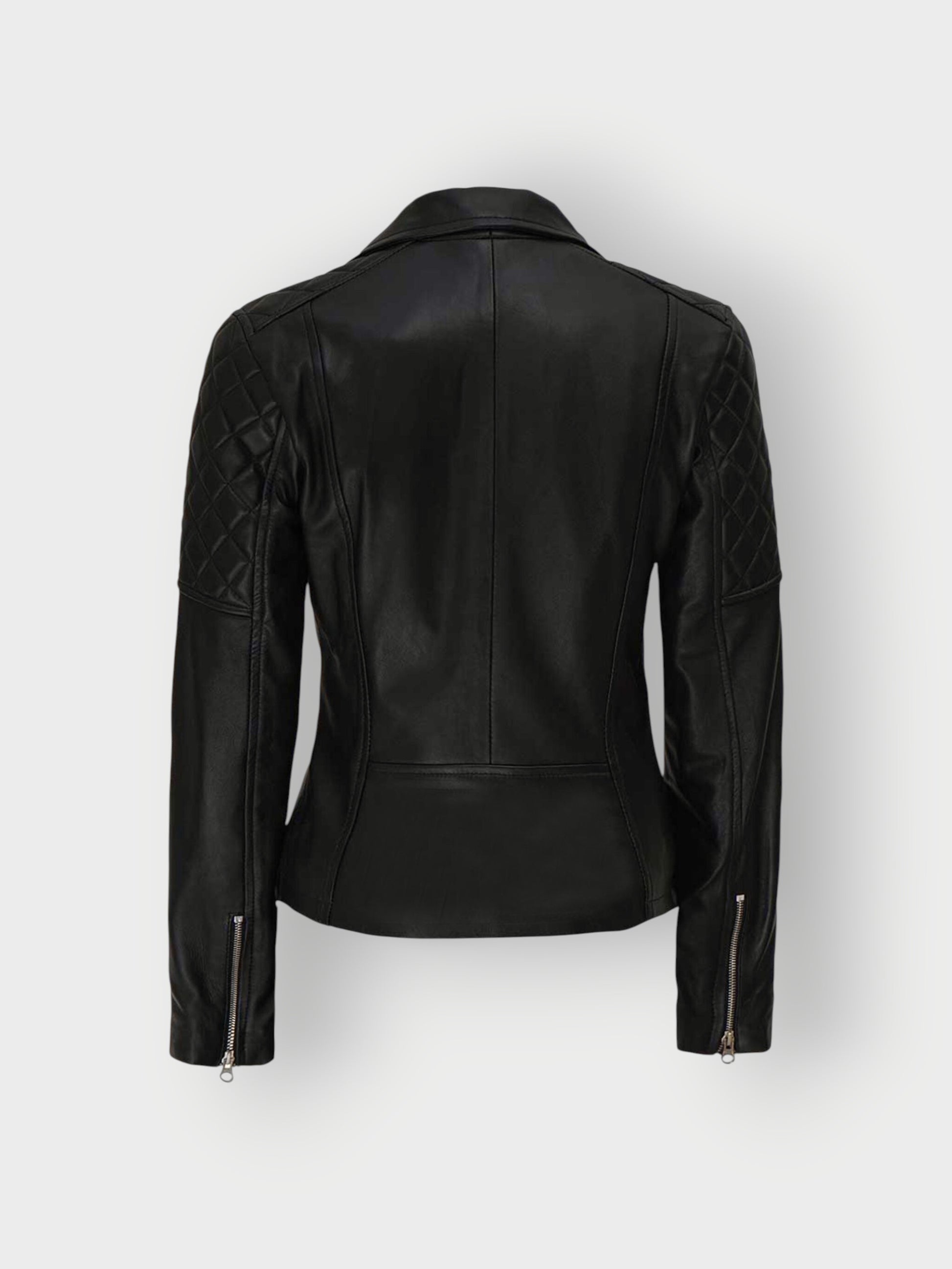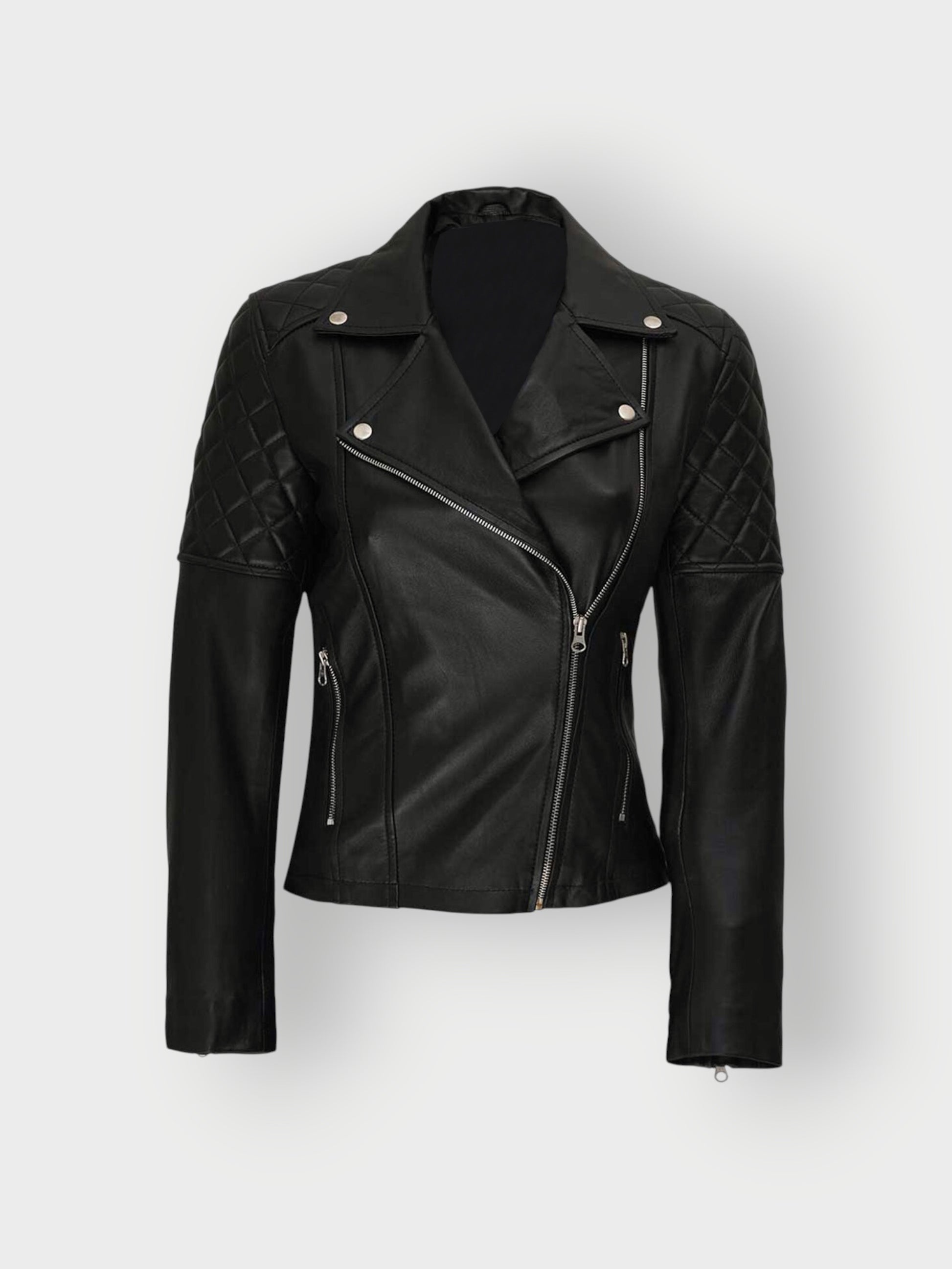 This jacket is for those who appreciate the finer points of bold fashion. Our women's black leather moto jacket takes the iconic biker look and upgrades it with striking quilted panels on the shoulders. The sharp asymmetrical zip and wide lapels give you that timeless attitude, while the tailored fit keeps the silhouette sleek. It's the ultimate piece for adding texture, confidence, and pure style to any outfit you wear.