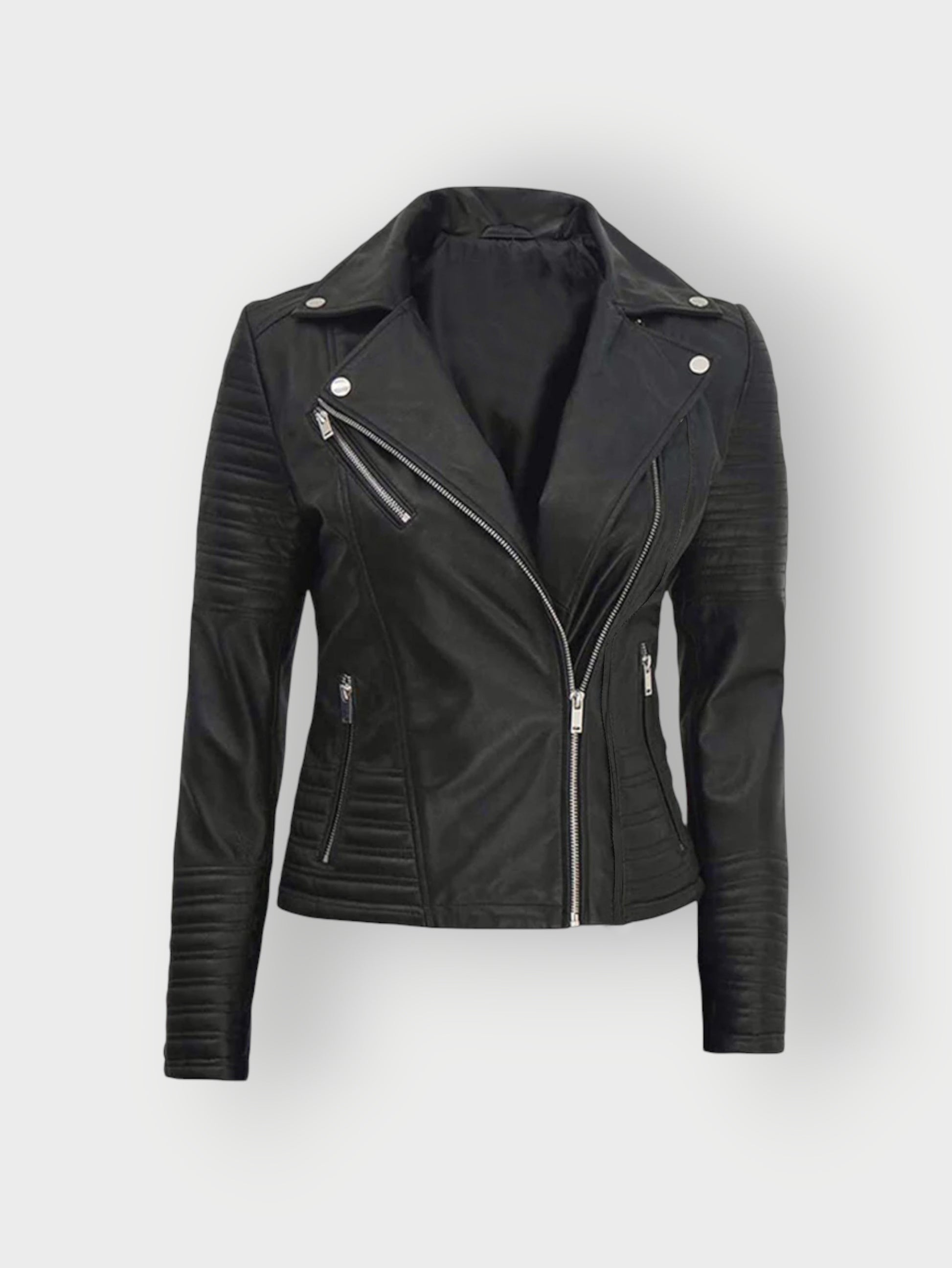 Style in Every Stitch. This jacket is the perfect example of how details make the difference. Our women's black moto leather jacket features an authentic asymmetrical zip and wide lapels, but its power comes from the striking horizontal quilted panels across the shoulders, sides, and arms. This texture adds a dynamic edge to the smooth leather, creating a confident silhouette that is both fitted and unforgettable. Throw it on to give any look instant, high-impact style.