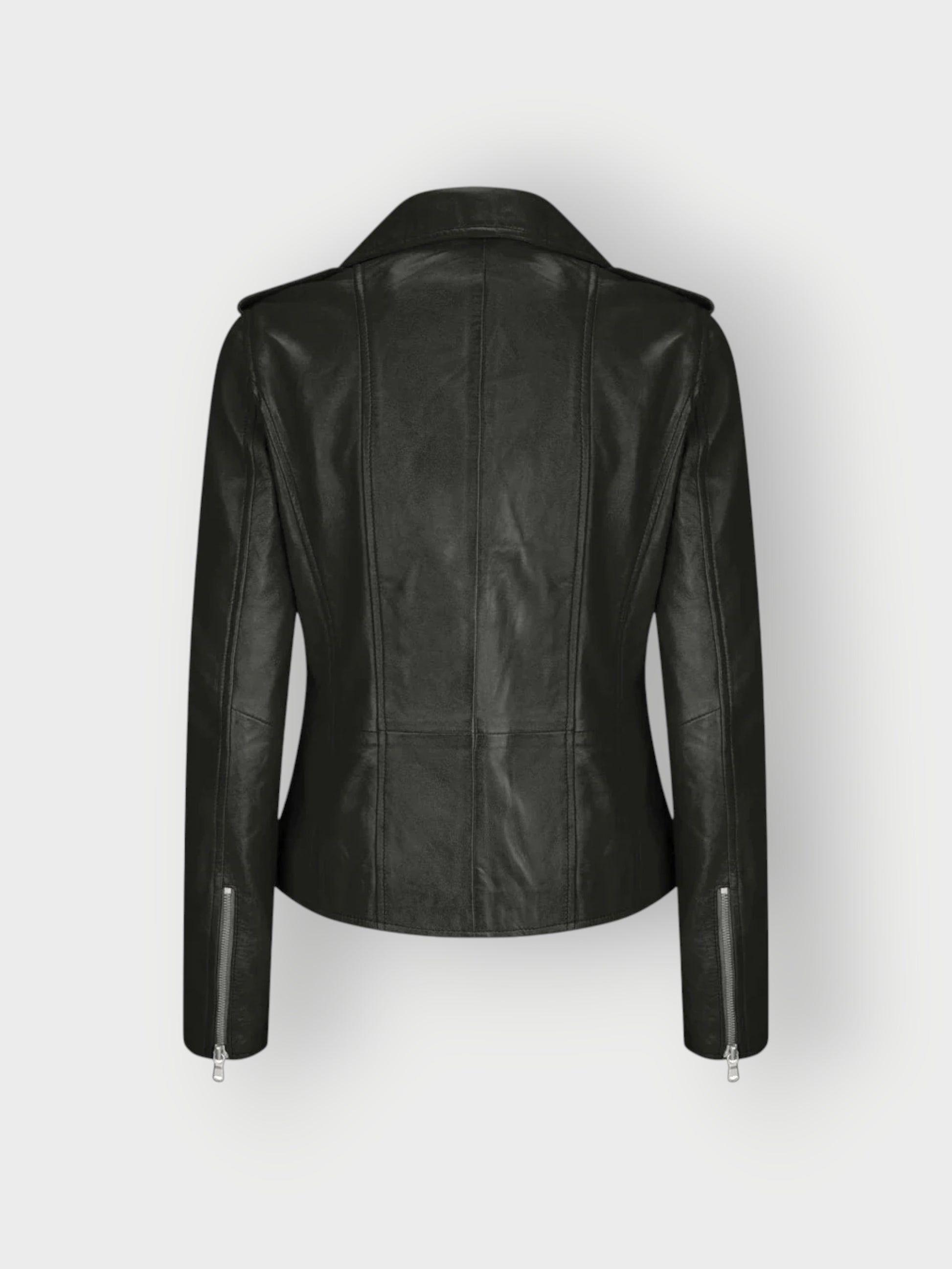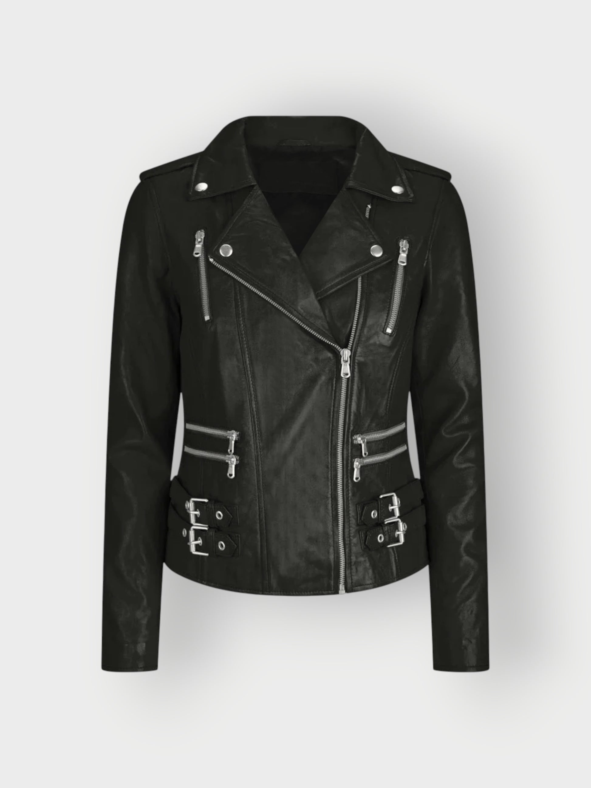 This jacket is pure, undeniable attitude. Our women's moto racer black leather jacket is the most authentic take on the classic biker design, built for those who aren't afraid to make noise. It features a bold asymmetrical zip and a strong silhouette, highlighted by sharp silver hardware and prominent buckle details at the waist. Throw this on and instantly own your powerful, confident style.